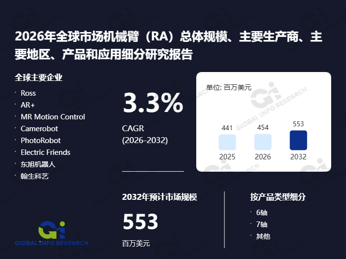 机械臂(Robotic Arm,简称RA)是一种可编程的从动化机械安拆,凡是由关节、连杆和施行结尾(如夹爪、焊枪等)形成,通过电机、液压或气动系统驱动,可以或许模仿人类手臂的部门功能,正在设定的空间范畴内完成挪动、抓取、拆卸、喷涂等切确操做。其焦点特点包罗高反复精度、可顺应或枯燥、并通过传感器取节制系统实现矫捷径规划和及时调整,普遍使用于工业制制、医疗手术、物流分拣、太空摸索及办事范畴,全球领先的市场演讲出书商环洋市场征询(Global Info Research)近日发布了题为“2026年全球市场机械臂(RA)总体规模、次要出产商、次要地域、产物和使用细分研究演讲”的最新研究演讲。该演讲针对全球机械臂市场展开了全方位、多角度的深切调研取阐发。研究内容全面笼盖全球总体市场规模、沉点区域及国度市场表示、次要出产商的营业结构取市场策略、焦点产物类型、销量取收入数据、价钱走势及企业最新成长动态;同时,演讲深切分解了机械臂市场的驱动要素、行业面对的挑和以及将来成长趋向,并对财产链布局、上下逛联系关系环节及发卖渠道进行了系统梳理。演讲数据逾越十一个年度,既包含对2021年至2025年的汗青回首,也包罗对2026年至2032年的前瞻预测,靠得住、具备前瞻性的市场洞察,帮力其进行科学计谋决策。按照环洋市场征询的调研数据,按收入计,2025年全球机械臂市场总收入约为4。41亿美元,估计到2032年将达到5。53亿美元,正在2026年至2032年的预测期内,年复合增加率估计为3。3%。